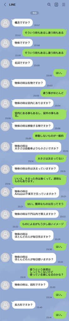 2:回答者が、はい、いいえで回答できる質問で正解の言葉を絞り込んで当てます。